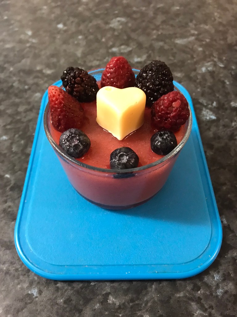Pour into glasses and chill overnight until firm. Before serving, spoon 2 Tsp raspberry sauce over each plum panna cotta. Then garnish with one white chocolate each that you have unmould and some berries around the white heart chocolate. You may use plums pieces for garnish. Serve immediately. Enjoy!!!!
