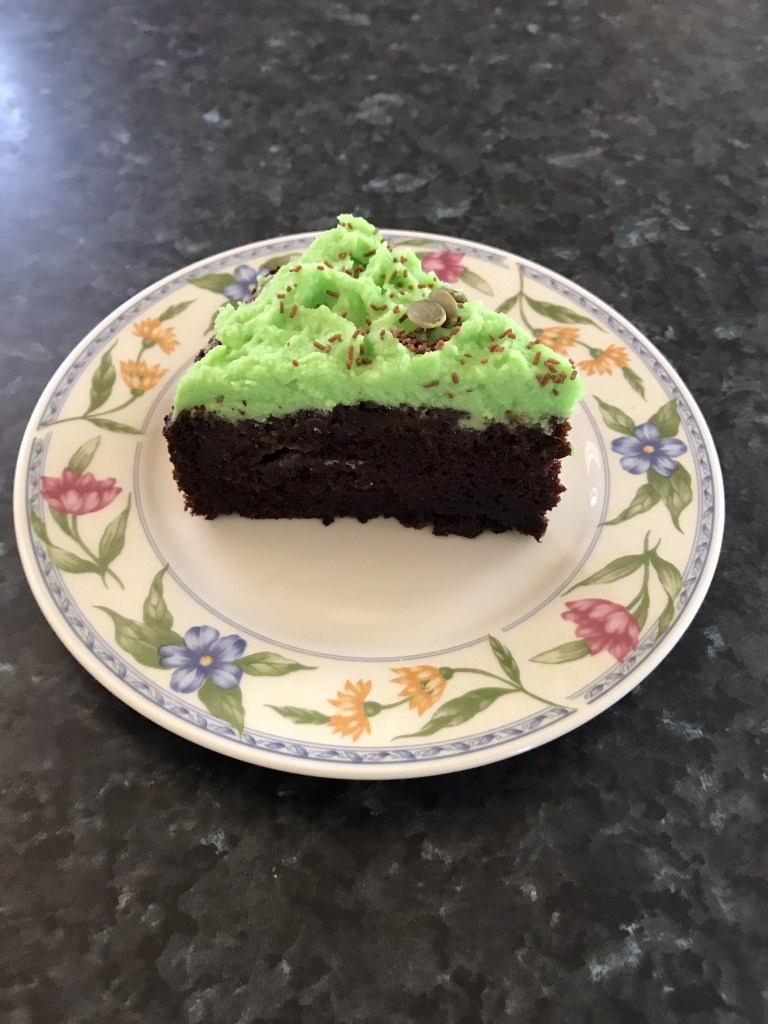 Just before serving cake about 1 hour, bring out ganache, beat it again with a tiny drop of green colour like cream until thickened, double in size. Spoon a big dollop of ganache in the middle and spread out all around the top of cake with a butter knife and make some design. Scatter some pepitas around the ganache and place a candle in the middle as this is a birthday cake for my nephew. Cut and serve on its own or with more pepitas or tea or coffee or dessert wine. Enjoy!!!!!