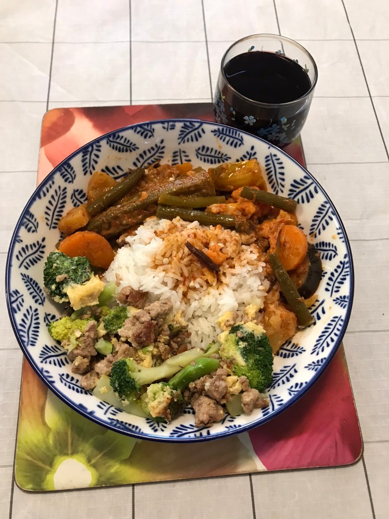 Heat up the curry for about 20-25 minutes, not to over boiled but warm enough. To serve, plate a bowl of rice into the center of bowl, then spoon the warmed up curry onto the top of the rice at the right end; spoon a spoon of grave into the center of rice. Followed by broccoli minced pork egg on the left end of the rice. Enjoy with a glass of red wine!!!