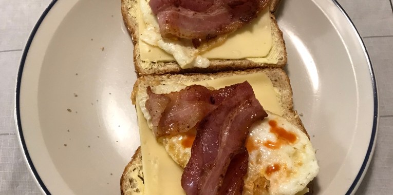 Lazy Sunday meal with less utensil to wash. Too cold to go out to get food and there are shortages of food due to flood. I have bacon, egg, cheese and bread.