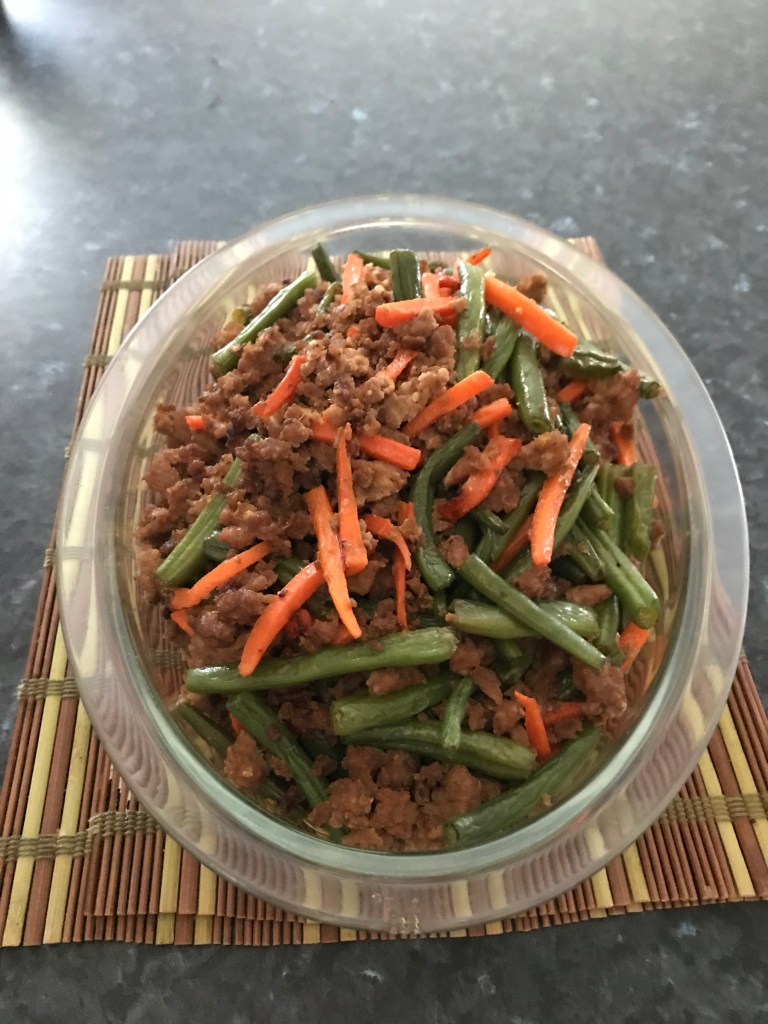 Felt like having minced pork today and I have carrots. My mom gave me some green beans. I have cooked a big batch so that I can eat it later with my favourite shin ram yun noodles or kwonlow mee.