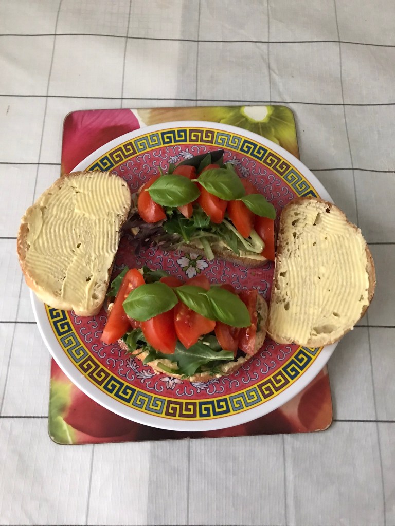 Place the pane di casa on plate. Then add enough salad, season with salt and pepper. Sprinkles chili flakes as I must have chili in my diet. Followed by tomatoes wedges and top with basil leaves from my garden pot. Enjoy with a glass of Moscato or coffee or tea or limoncello.