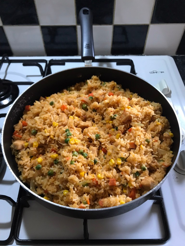 It’s a challenge that I am taking on with different ingredients, flavourful and colourful added to it technique of using a pan. My rice is orange bright colour, cooked in-one pan dish that is flavourful spicy, colourful, healthy, and delicious. It sure is well worth the attempt let’s cook!!!!