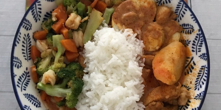 Make sure curry is really warmed up not boiling heat, you can add hard boiled egg into the curry to warmed up. Spoon mixed vegetables and prawns on the left of plate, followed by cooked white rice in the lower center and cut open the egg place curry over and then spoon chicken and potato curry with lots of curry all around the bottom of plate. Serve immediately with red wine. Enjoy!!!!