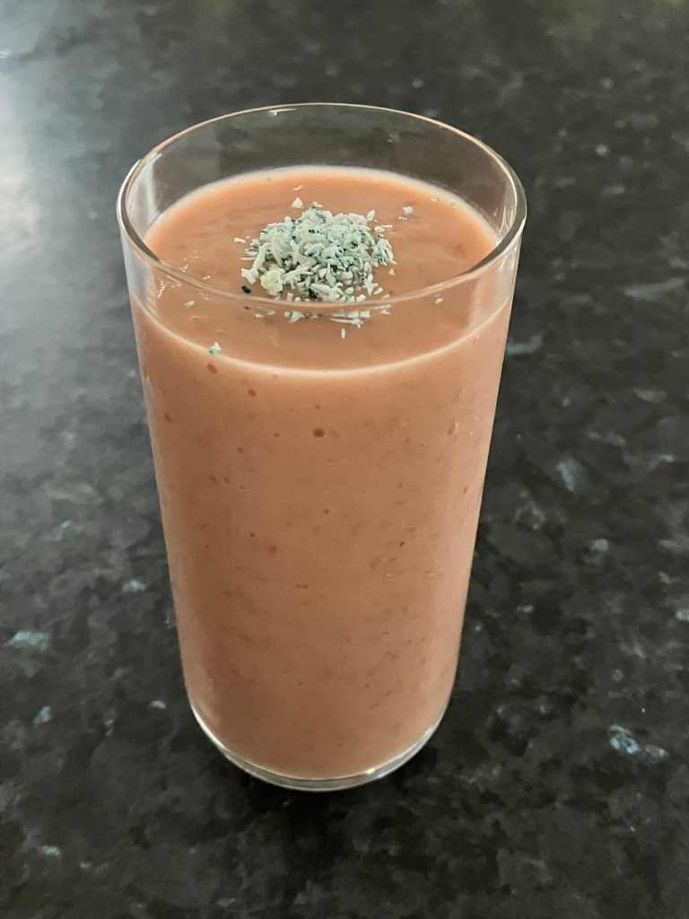 Got abundance of figs n my garden, I decided to make smoothie with leftover mini tomato, green shredded coconut and apricot jam. To that I have added some strawberries and milk.