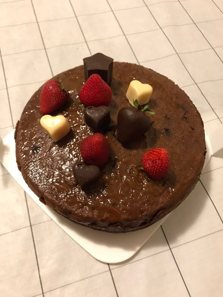 Just before serving, spread jam on top of cake, then arrange 1 star chocolate space out and add 2 dark heart shapes chocolate, in between put 2 fresh strawberries; followed by 2 white heart shapes chocolate opposite each other on the second heart shape chocolate, then 2 fresh strawberries opposite the second fresh strawberry in between dark chocolate and a strawberry chocolate next to the first dark heart shape on top of cake. Serve the cake with extra fresh strawberries and dark, white, and strawberries chocolates. Enjoy it with a hot cup of coffee or a glass of dessert wine.
