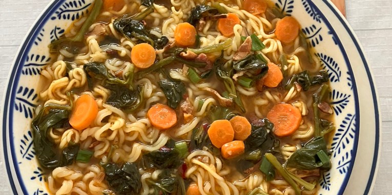 Once water is boiled, pour enough water into the prepared bowl. Stir to mix well. Open the microwave door, carefully place the plate with bowl of noodles, carrot and water in. Microwave for 5-7 minutes. Then open the microwave door; carefully remove the plate with bowl from microwave and spoon enough leftover warrigal greens, carrots, and smoked honey bacon in black pepper butter sauce into the hot bowl of noodles soup. Stir to mix well.