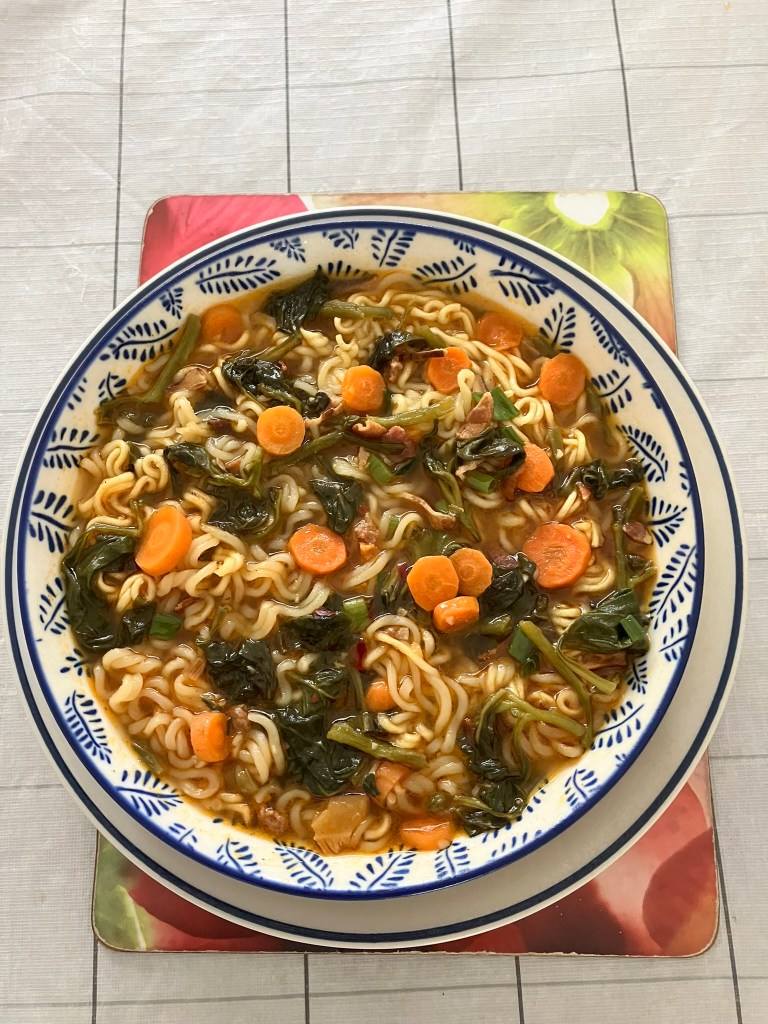 My sister bought shin ram yun noodles from Costco, I used leftover warrigal greens, carrots, and smoked honey bacon in black pepper butter sauce; recipe below, on a freezing day, adding one more carrot. They’re my favourite noodles, and I never tire of them.