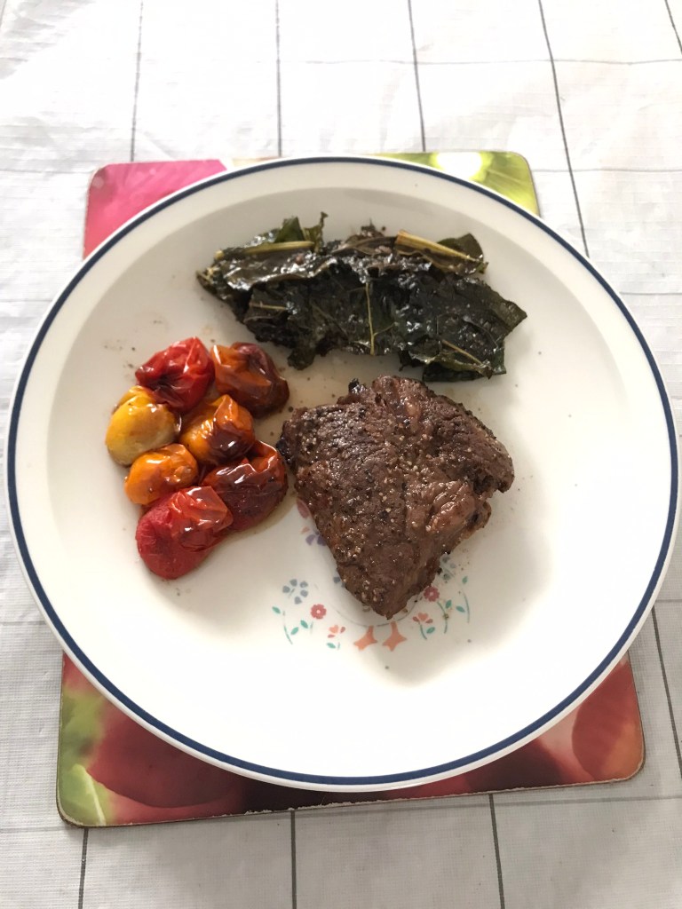 This is a simple meal of black pepper rump steak with kale and cherries tomatoes. Not using a lot of utensils. I am not searing my rump steak. I am just going to put it straight into the oven. My dinner is moist, medium cooked and peppery delicious. Let’s cook!!!