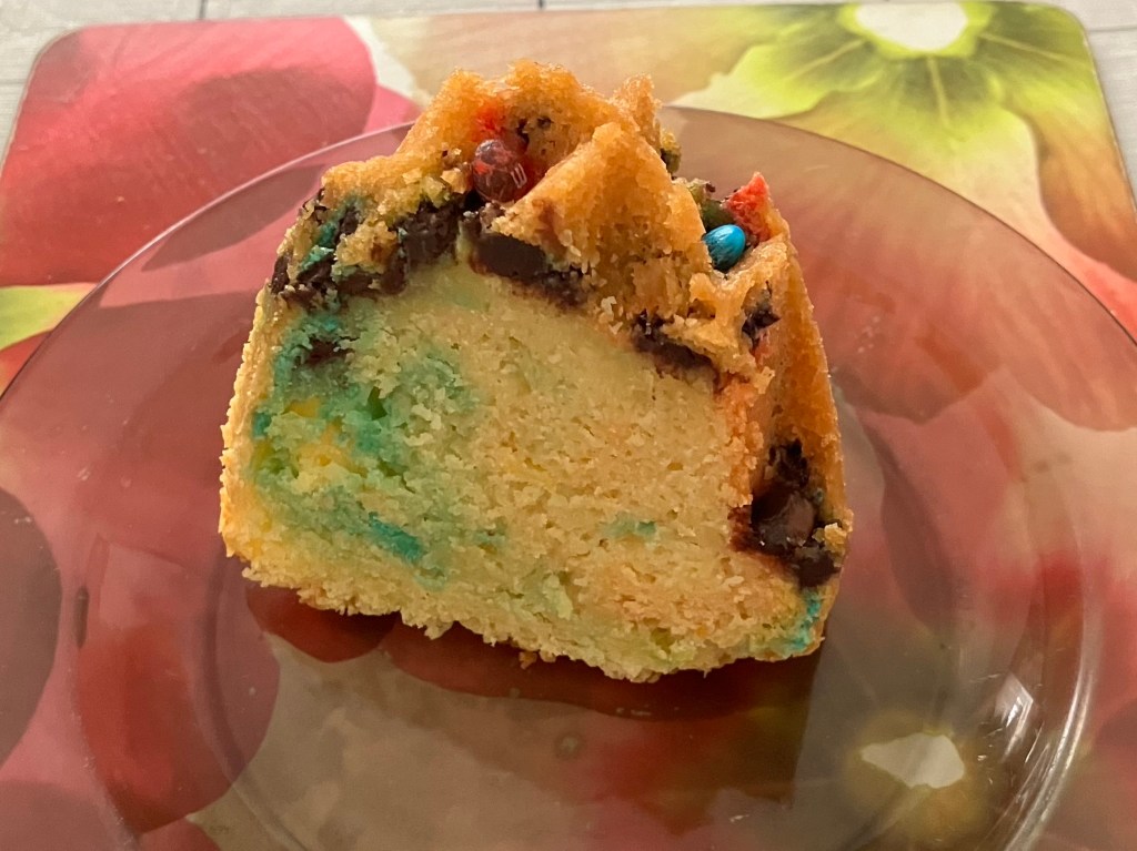 Once batter looks good batter consistency, spoon some batter into prepared pan, sprinkles some M & M’s mini chocolate over the batter. Then spoon some more batter over, and sprinkles the remaining M & M’s mini chocolate over and lastly the remaining batter on top, smooth the top. Bake for 1 hour or until skewer out clean. Switch off oven, leave cake in oven for 35 minutes with door close. Remove from oven let it cool completely in pan for 1 hour. Then flip it over onto cake plate mat. Let it sit for about 1 hour or just before serving decorate the cake with 20 M & M’s mini chocolate. Slice and serve with coffee, tea or dessert wine. Enjoy!!!!!