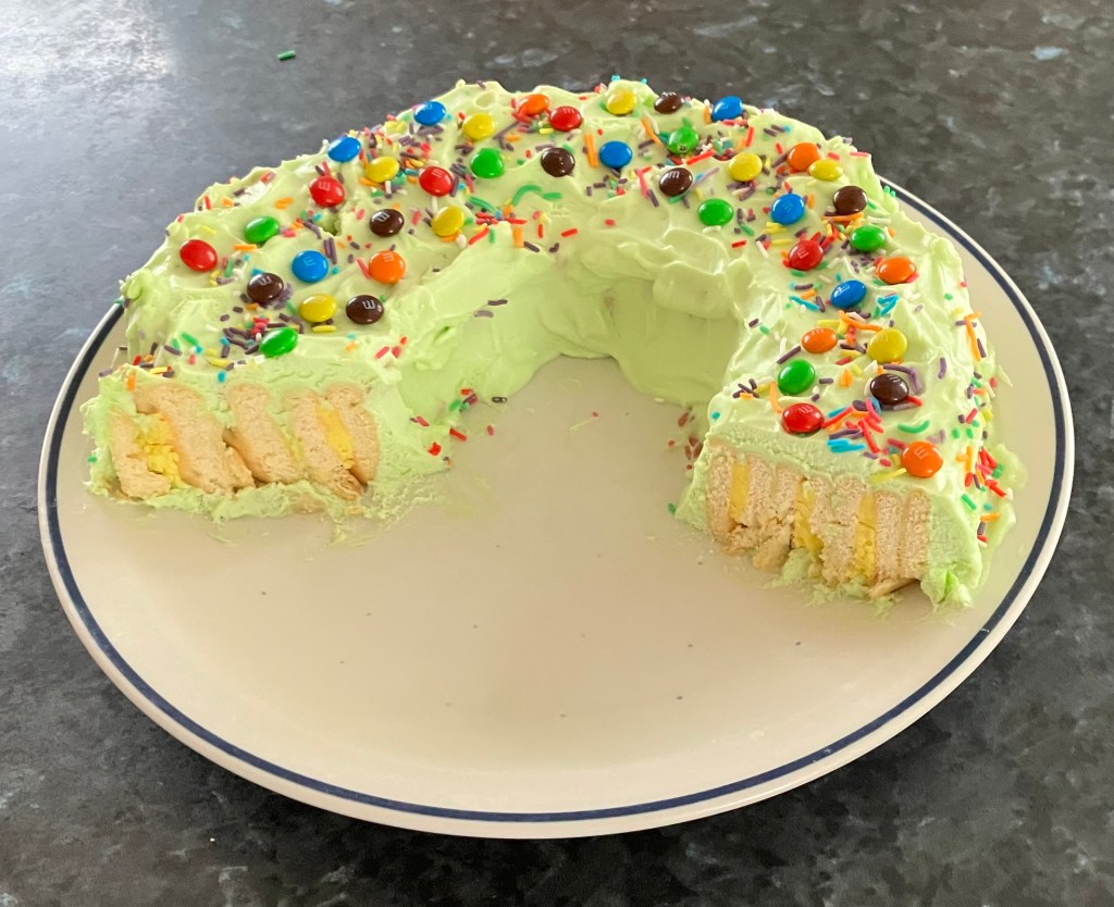 Now bring out the frosting, open the lemon crisp and get a big plate. Spoon some frosting onto plate in a circle. Next take one lemon crisp and smear some frosting on one side and place on top of the circle frosting. Followed by another lemon crisp and smear frosting on one side and glue them together. Repeat with the remaining lemon crisp, and frosting one side and glue them all until you form a circle.