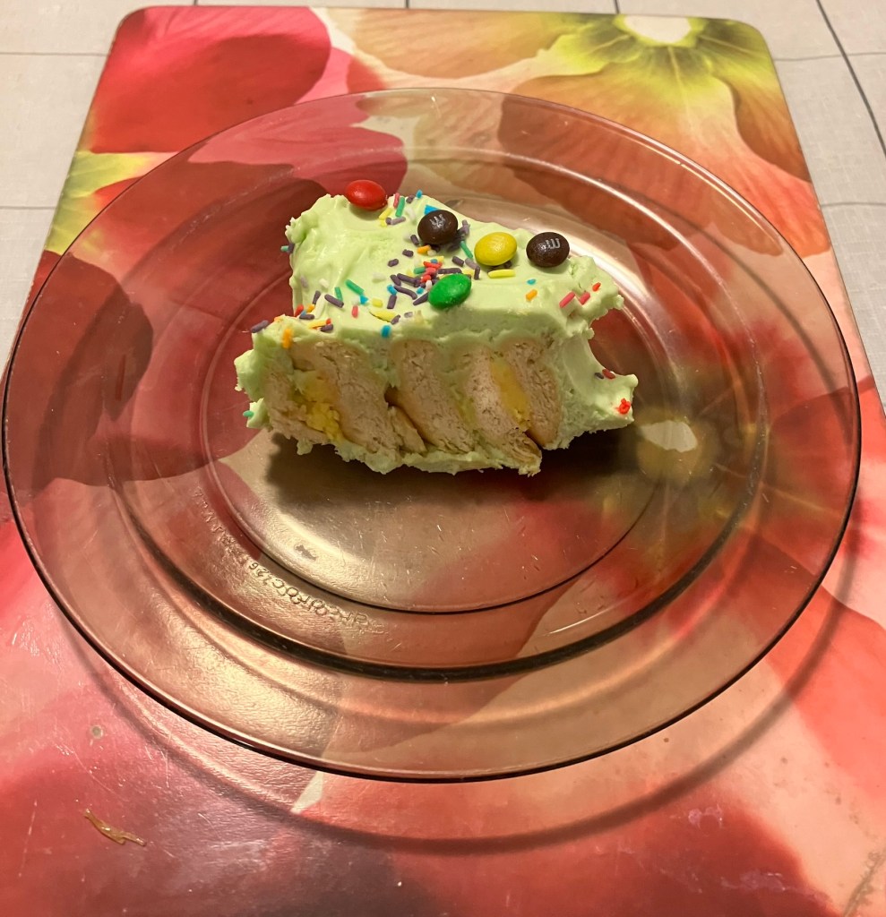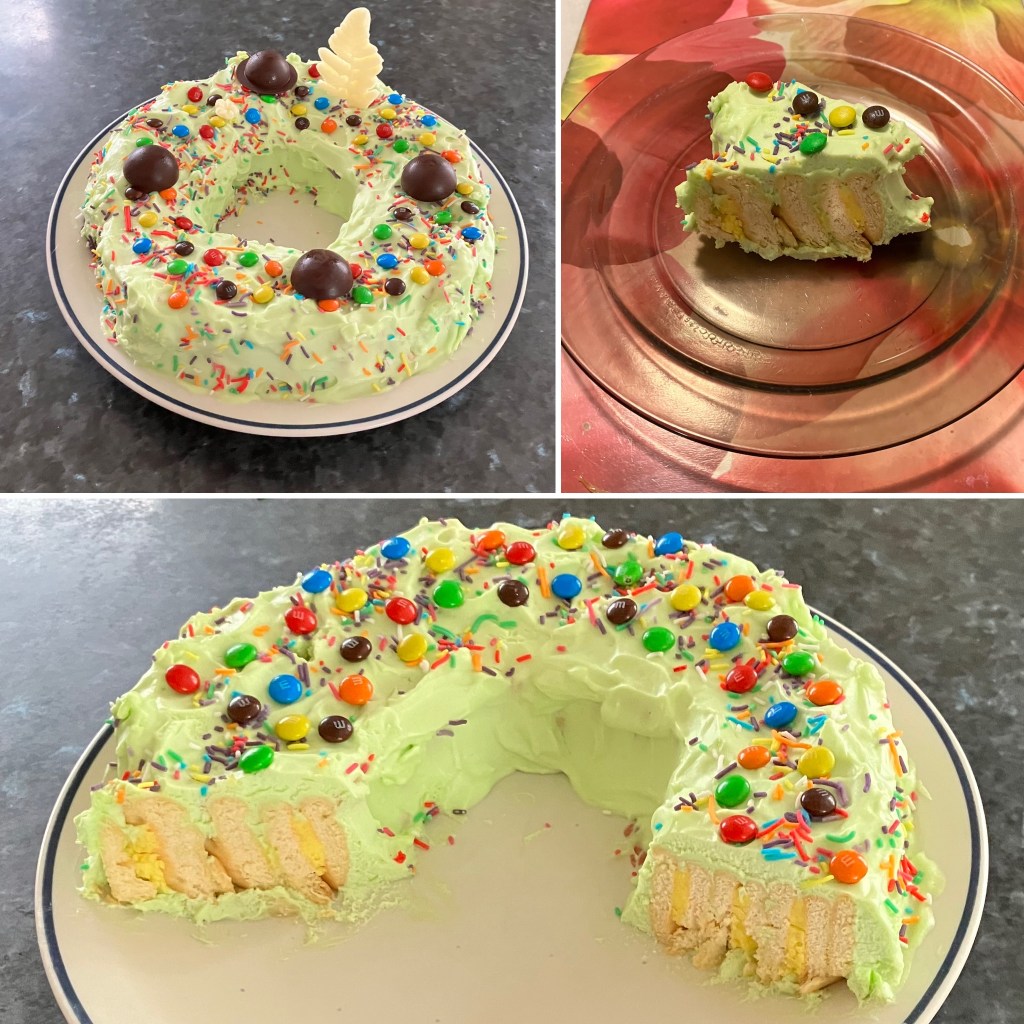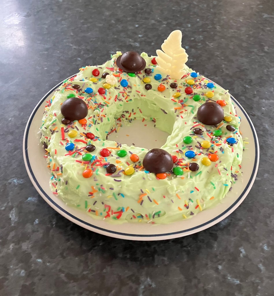 This time, I am making my frosting with a tiny bit of green food colouring and a hint of peppermint. To that, I am adding a small white chocolate Christmas tree, 4 domes of dark chocolate, and using M&M mini Smarties with colourful bright sprinkles. With the extra white and dark chocolate to serve with the wreath. My dessert is colourful, creative, fun, and delightfully delicious. Merry Christmas, everyone!!!!