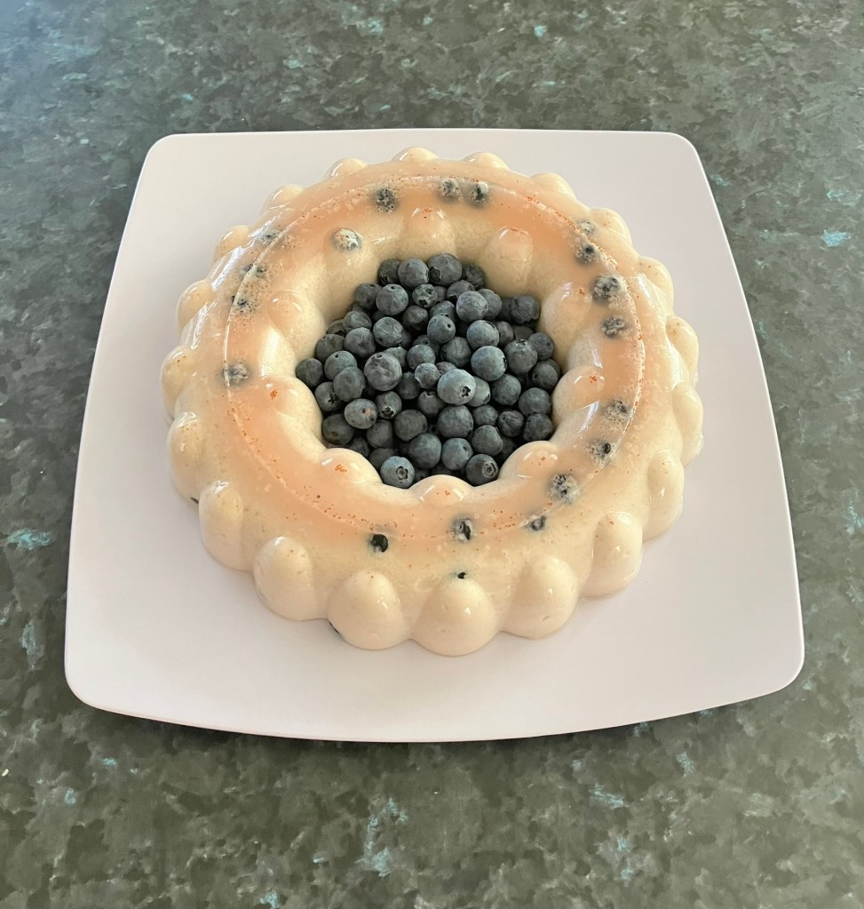 Place the whole pot in a basin of water to cool it slightly. Meantime greased the jelly mould with oil all over. Not too much though. When the pot feel cold to touch, slowly pour the milk mixture into the jelly mould. Next scatter 200 of blueberries all over the milk mixture. Then cover with the jelly cover and place in fridge to set about 4-6 hours or overnight. Serve with blueberries and strawberries. Enjoy!!!!