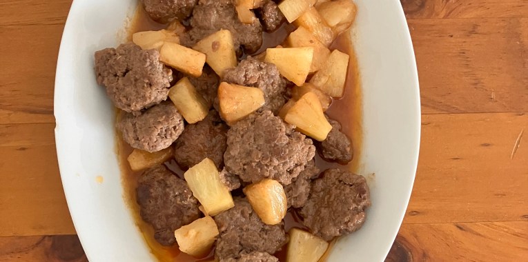 Add the meatballs and the remaining pineapple pieces to warm up about 4-5 minutes. Spoon onto serving plate and eat it with cooked rice and with a glass of white wine. Enjoy!!!!