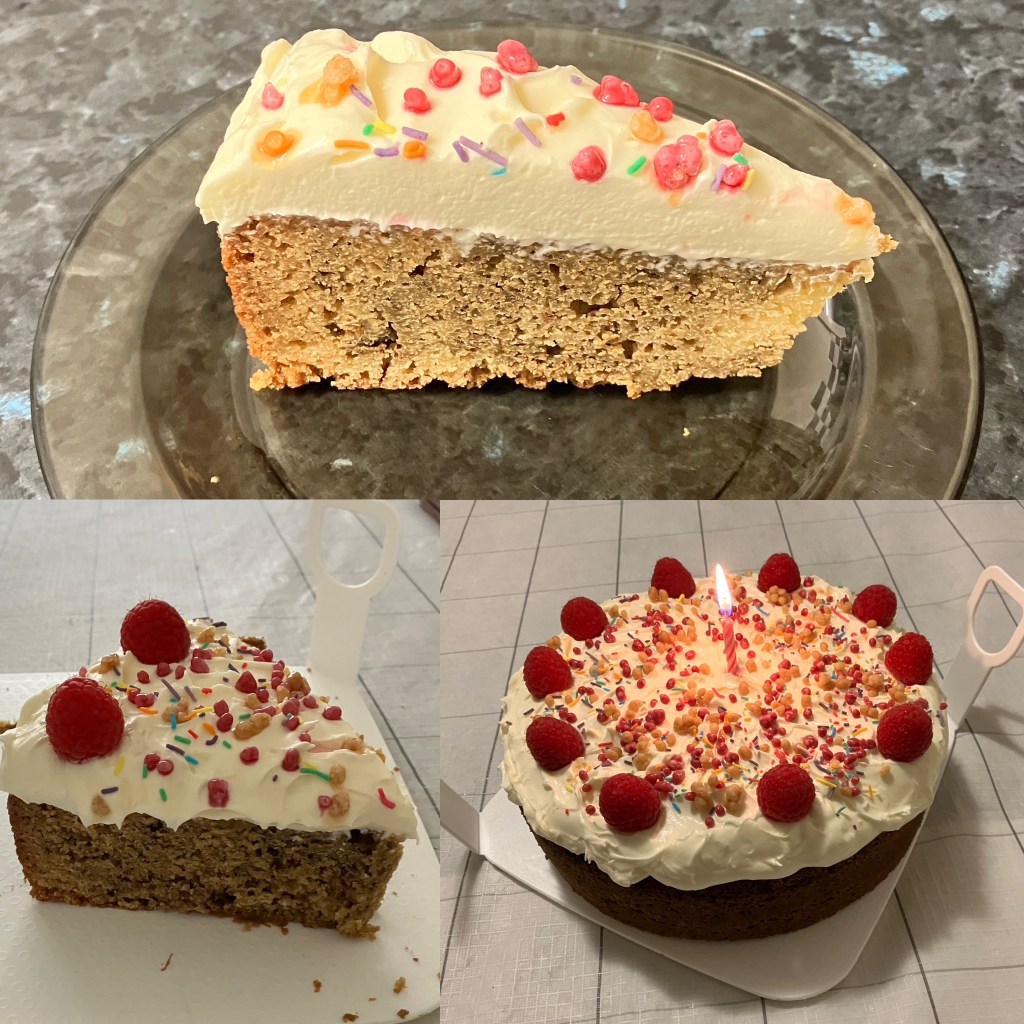 Now add in milk, beating again until increase in volume about 5 minutes to make it spreadable consistency. I place it in the fridge for 20-30 minutes. You don’t have too. (See Note). Just before serving about 10 minutes, spoon a big dollop of the frosting onto the centre of the cool cake. The spread out and all around the top of cake. To garnish, Sprinkles raspberry flavoured candy toppers with my leftover salted caramel toppers and colourful sprinkles. Place a candle in the middle as it is a birthday cake.