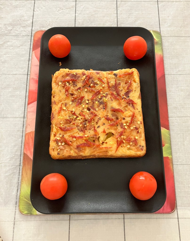 Saw a post on pasta frittata from Basilicata. I had changed the ingredients and cooked in a square saucepan. Google: “What does the word frittata mean? There is an Italian expression ‘hai fatto una frittata’ which more or less means you have made a mess (figuratively or literately!). Perhaps, the expression came into being when a frittata was merely a way to use up whatever leftovers were in the fridge and not actually considered a culinary delight!”