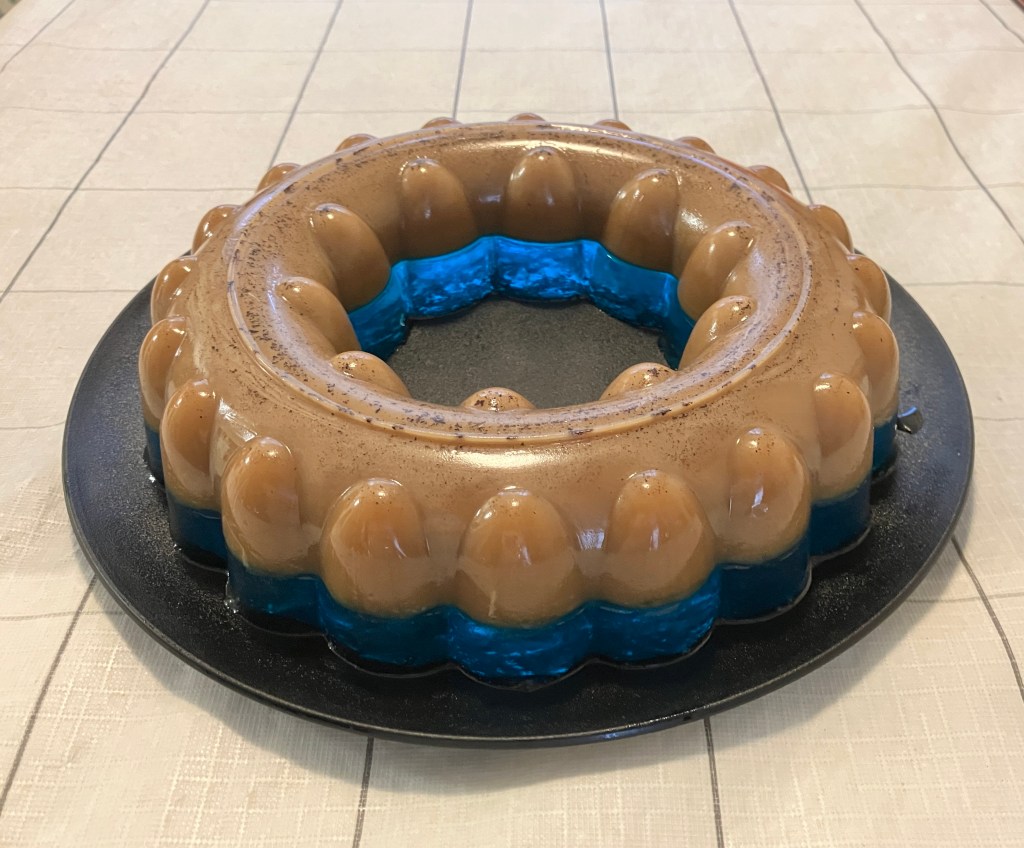 Google: “Coffee jelly is made from sweetened coffee added to agar, a gelatinous substance made from algae and called kanten in Japanese. It may also be made from gelatin rather than agar, which is more common in European and American cuisine. It is often cut into cubes and served in a variety of dessert dishes and beverages. “Berry Blue jelly has substances essential of fruit flavour, pectin, sugar, acid and water. A pectin gel or jelly forms when a suitable concentration of pectin, sugar, acid, and water is achieved.”