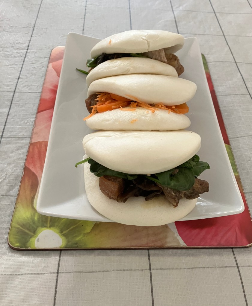 Google: “Bao Buns (pronounced “bow”), but also known as a ‘steamed buns’ or ‘baozi’ 包子, are a delicious, warm, fluffy treat of stuffing wrapped inside a sweet, white dough. Made with a mix of flour, yeast, sugar, baking powder, milk and oil, the bao is a tad sweeter than its closely related cousin, the dumpling. The taste of Chinese bao buns depends on the filling inside them. Most fillings are savory and mildly sweet. There are so many different ways to make bao buns that the bao taste is rarely ever consistent. You can add mushrooms, pork, chicken, beef, and even chocolate for a sweet kick!”