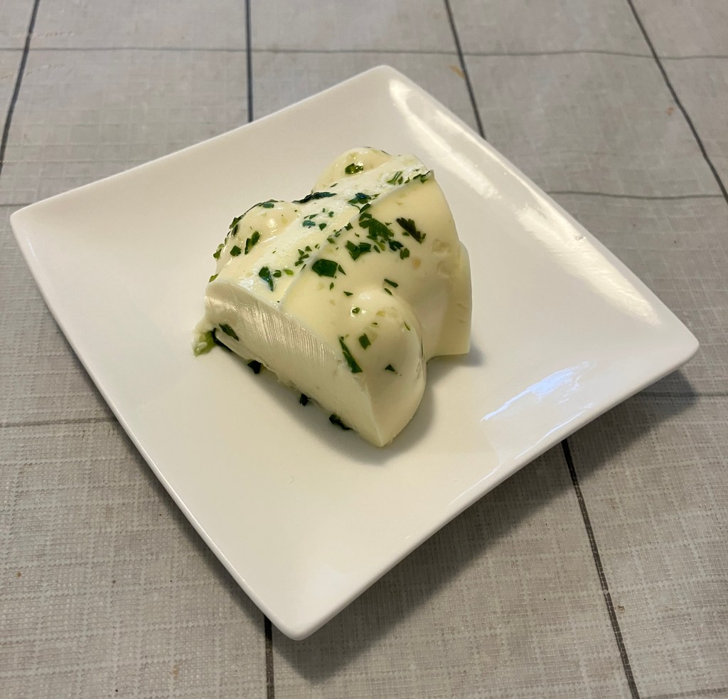 Before serving, flip over onto a plate. Unmould the panna cotta. Spoon a little bit more cilantro parsley pesto over the panna cotta. Wipe oil in the middle of the panna cotta plate dry and all around. Serve with a cup of coffee, tea, or dessert wine. Enjoy!!!
