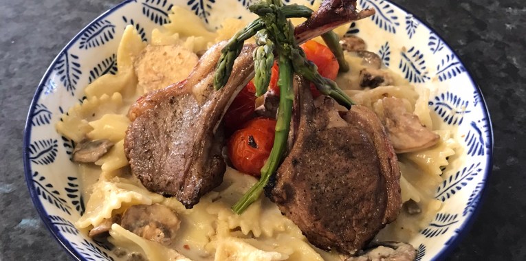 Meanwhile, cook pasta according to instruction on packet, to your taste. Drain well and add cooked pasta to mushroom sauce and toss to combine, adding a little pasta water if needed to have extra sauce. Check seasoning. Spoon pasta onto bowls. Place the cherry tomatoes in the center. Next remove the foil, place the lamb on top resting on each other with the cherry tomato to help stand up. Followed by the asparagus leaning on the rack of lamb. Enjoy with a glass of wine!!!