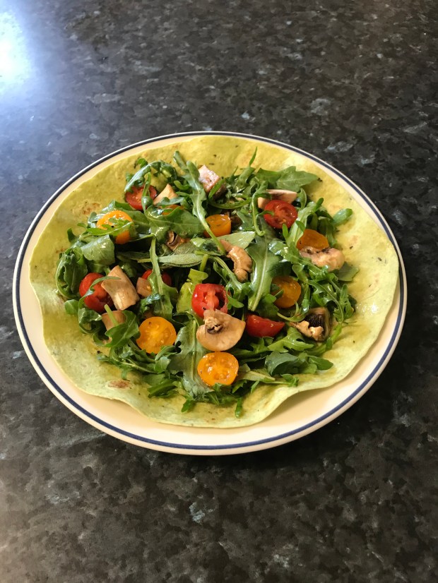 In a bowl add rocket, tomatoes, mushrooms and sage leaves. Then season with salt, pepper. Drizzle oil, and vinegar. Just before wrapping, dash Worcestershire sauce over.