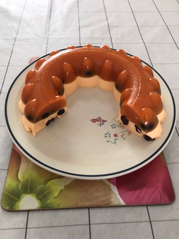 Put kettle on and when water is boiled pour 250 ml hot boiling water into a bowl and add orange jelly powder in, stir until dissolved. Then add 100 ml cold water and stir again and set to cool slightly. Meantime, add 100 ml cold water and 1 Tsp gelatine in a jug, stir well to combined.
