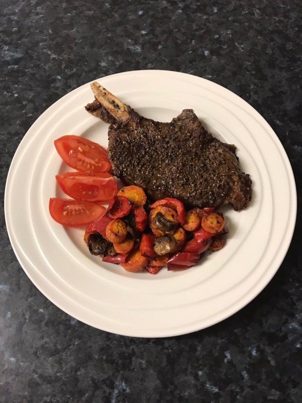 Bought bone on rib eye on sale. It had been ages; I had not had it with black pepper rub. With left over 3 tomato wedges, carrot, mushroom and red capsicum to go with it. Google: “bone-in ribeye has more muscle, is chewier, and ideal for smoking. Boneless ribeye has less tissue, is less chewy, and better suited for grilling. As a takeaway, remember bone doesn’t affect the taste of your ribeye.”