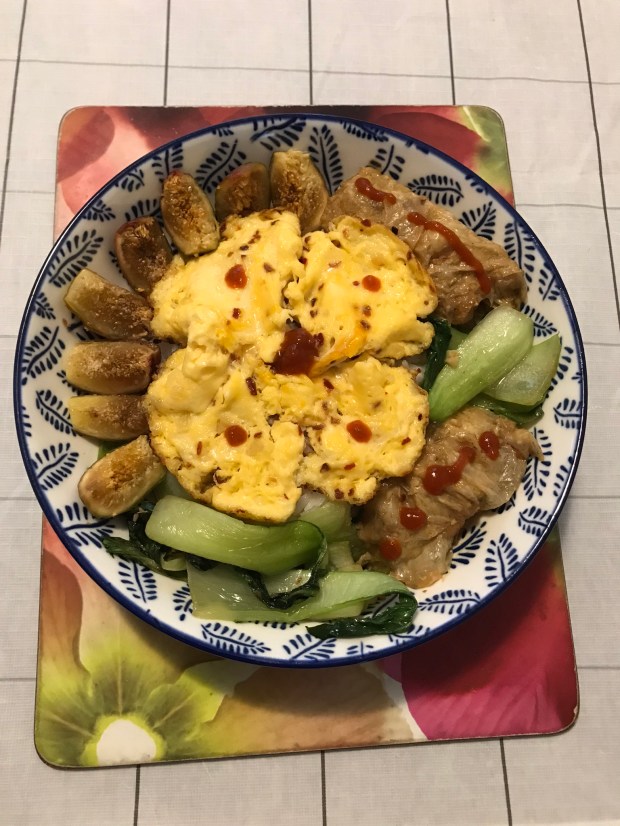 Saw on tik tok somewhere on how to make butterfly egg scrambled. I tried it and it looks beautiful. I am having it with bought a box of 10 rolls kin tok kin and bought buk choy on sale. Figs are abundant in my garden. Today, I have craving for figs. I am going to add it into my dinner. I am also craving for chili sauce.