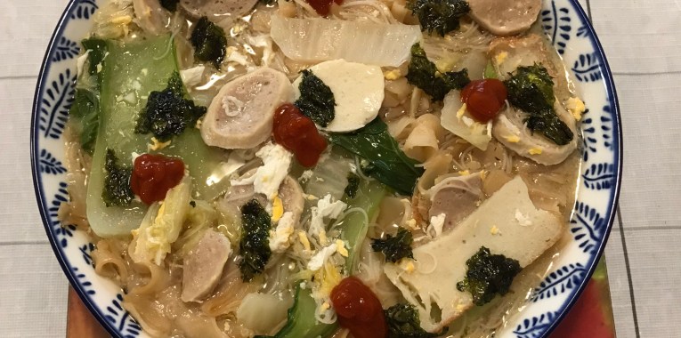 Heat up 2 Tbs oil in the wok and fry garlic until golden brown. Next add cabbage leaves, and bok choy; stir fry for about 5-7 minutes until vegetables are soft. Next add hor fun and vermicelli stir toss for about 6 minutes or until both turn soft and not wet. Then add fish balls, fish cakes, and pork balls stir to mix well for about 5-8 minutes.