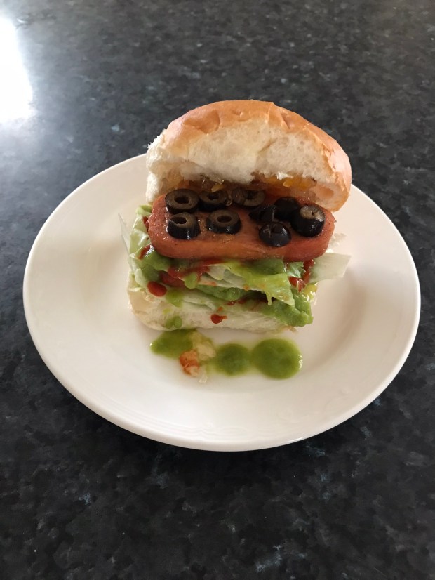Place some more lettuce on top and followed by the second slice of spam meat. Next add sliced black olives on top of spam meat. Place the top half bread roll on top. Enjoy with a cup of tea!!