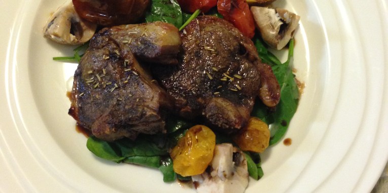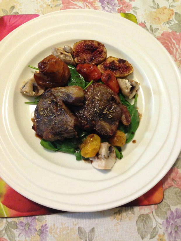 Once cooked, rest 5 minutes. Meantime, wash drain and ensemble spinach and mushrooms equal portion on plates then followed by 2 chops and scatter tomatoes and figs around it. Serve with red wine. Enjoy!!!