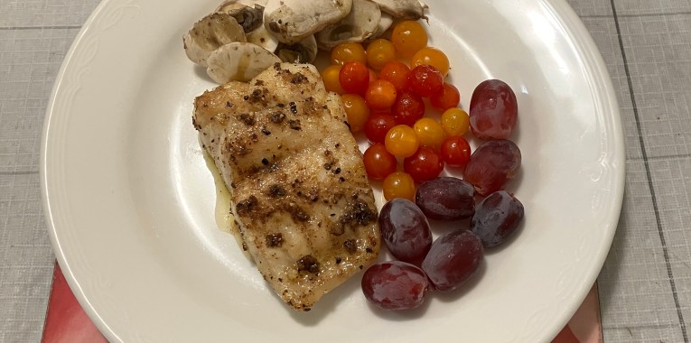 Bought 1 barramundi fillet on sale. Forgot to buy salad. Luckily, I have medley tomatoes, sliced mushrooms and red grapes. This is my first time cook barramundi, and I thought of putting my air fryer to use. Also to finish off my tiny bit of XO chili oil from my friend. It’s a shame, my friend pass away before I could get the recipe of my friend XO chili oil. Will have to google recipe for it.