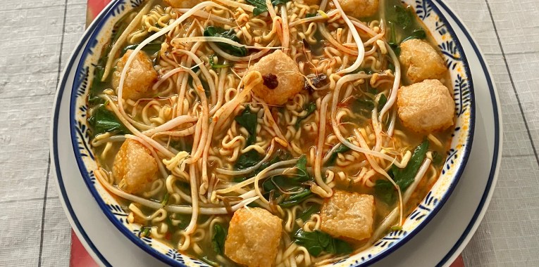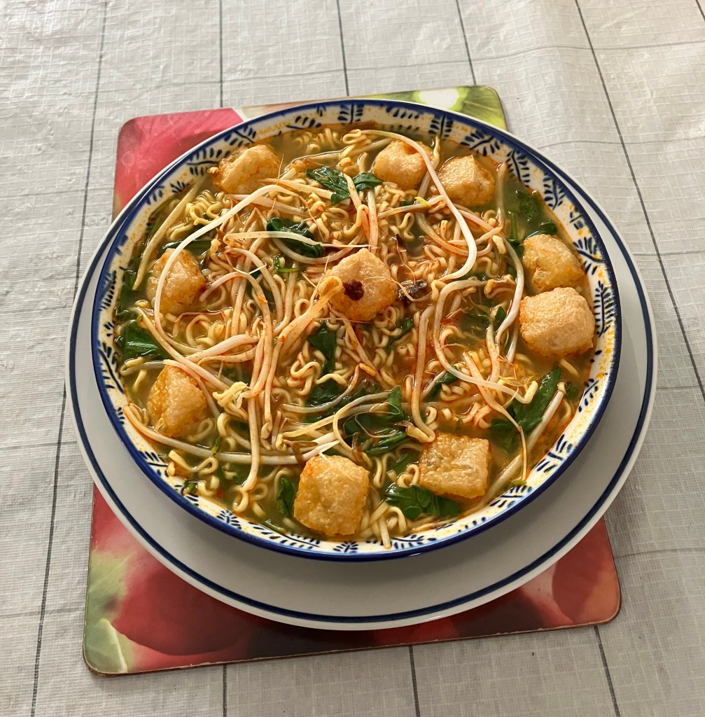 Put kettle on. Place the bowl on top of the plate. Empty the noodles and condiments into the prepared bowl with plate. Next place rocket and spinach leaves into the prepared bowl along with the thawed tofu pok. Pour enough hot water into the prepared bowl.