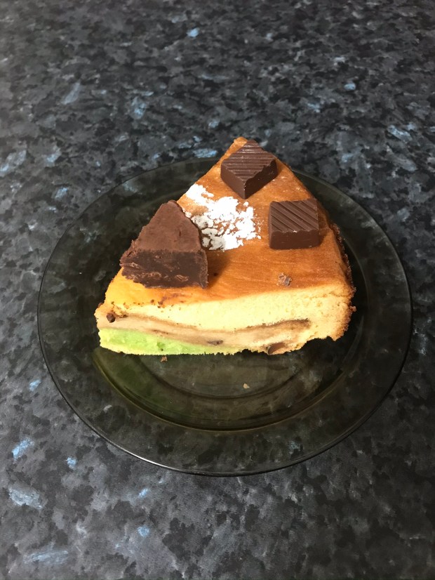 Next soak the round bottom panettone in sweet wine both sides. Then place it in the centre of the batter in pan. Now put the pandan batter on top of panettone and let it drip down the sides; its ok. Now top with the remaining batter, smooth the top.