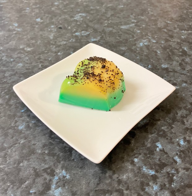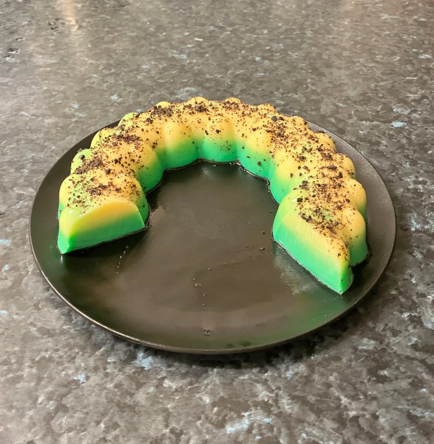 Meantime the remaining half vanilla custard milk mixture, add a tiny drop of green colouring in, stir until well mixed and colour are even. Bring out from the freezer. Add the green colour vanilla custard milk panna mixture on to the slight set panna cotta. Using a skewer or fork gently pierce some holes so the green colour mixture can drip into vanilla custard milk panna cotta just for designs. You don’t have to do it if you don’t want to.