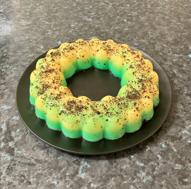 Today, I use store bought vanilla custard which I had intended to make sticky dates pudding but I realised that I don’t have any sticky dates. Instead, I replace thickened cream with my vanilla custard, added gelatine, skim milk, oreo crumbs with a drop of green colouring to brighten the dull Winter night. Let’s cook.