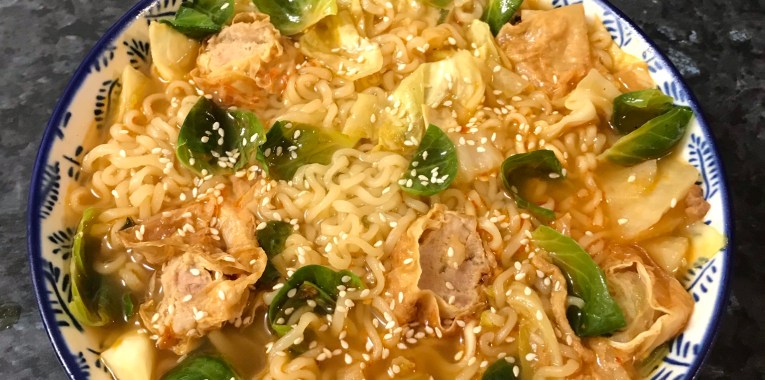 Put kettle on. Open the shin ram yun noodles and condiments that comes with it into a bowl. Once water is boiled; pour enough hot water into the bowl. Then place into microwave and cook it for 6 minutes. Next add the cooked Brussels sprouts, cabbage, and pork rolls into the noodles and cook a further 1-2 minutes to warmed up the vegetables, pork rolls, and until noodles are softened. Bring out of microwave, scatter the sesame seeds and enjoy with a hot cup of tea.