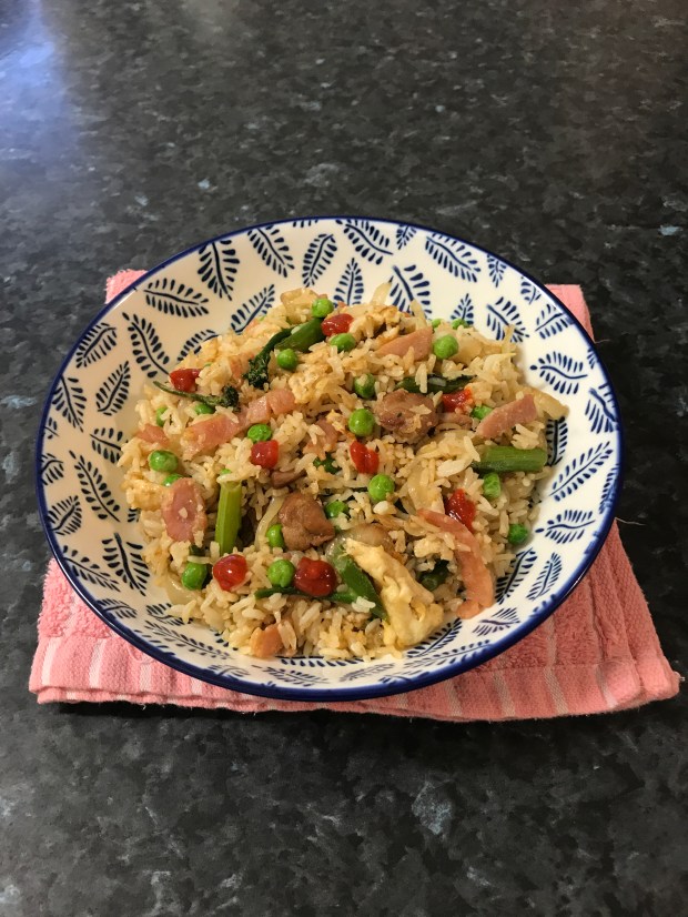 I discovered that I have leftover stir fry ginger caramelised pork and broccolini hidden at the back of my fridge. I have better use it before it can’t be eaten anymore. I have leftover rice as well. Added peas and ham to finished it off. You are going to say oh no not fried rice again. Well, it’s sure is practical quick and easy meal in time of lockdown and restricted to go out often.