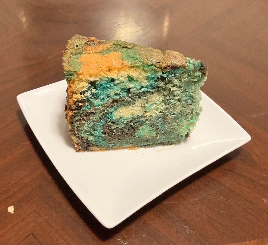 Since my last blue pea flower cake didn’t turn out blue as I wanted, I looked up recipes with blue food colouring and added melted chocolate for a marbling effect. I took a picture of half the cake before my niece, who was supposed to take some for her parents, kept it for herself and her husband. Later, my youngest sister came by and took the last two pieces, which I wanted for supper. The cake was colourful, moist, and delicious. Let’s bake!!!