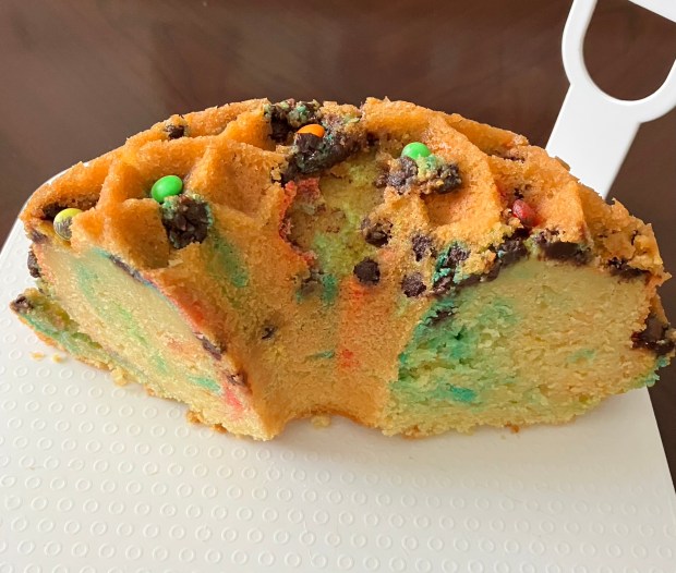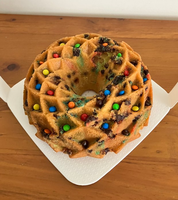 Once batter looks good batter consistency, spoon some batter into prepared pan, sprinkles some M & M’s mini chocolate over the batter. Then spoon some more batter over, and sprinkles the remaining M & M’s mini chocolate over and lastly the remaining batter on top, smooth the top. Bake for 1 hour or until skewer out clean. Switch off oven, leave cake in oven for 35 minutes with door close. Remove from oven let it cool completely in pan for 1 hour. Then flip it over onto cake plate mat. Let it sit for about 1 hour or just before serving decorate the cake with 20 M & M’s mini chocolate. Slice and serve with coffee, tea or dessert wine. Enjoy!!!!!