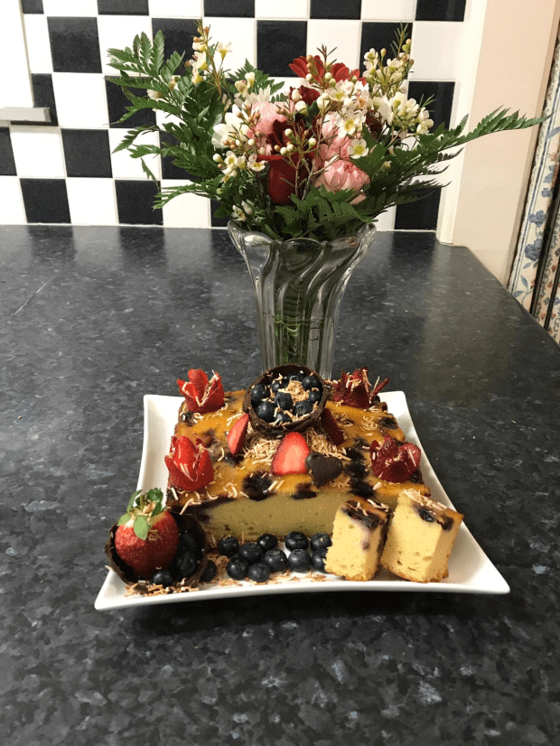 I have recreated Reynold’s MasterChef snitch. Though, it does not look as professional as his creation. The snitch chocolate look like Jurassic tyrannosaurus egg; about to hatch sitting in shredded coconut nest; heart shape chocolate is the heart the mother left there as a sign of protection. Strawberries flowers are the borders of their home and food. It’s moist, soft, and delicious with fruits, shredded coconut, and chocolate. Happy Birthday mom!!!!