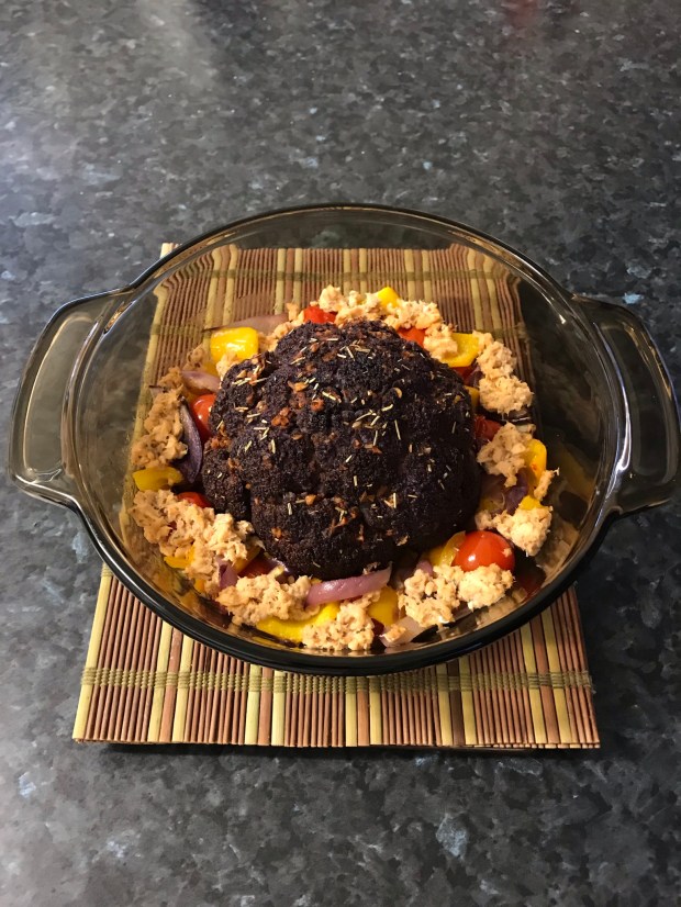 Here’s another creation of using purple cauliflower. With leftovers salmon and vegetables added in as a complete meal to eat with rice and leftover roasted chicken.