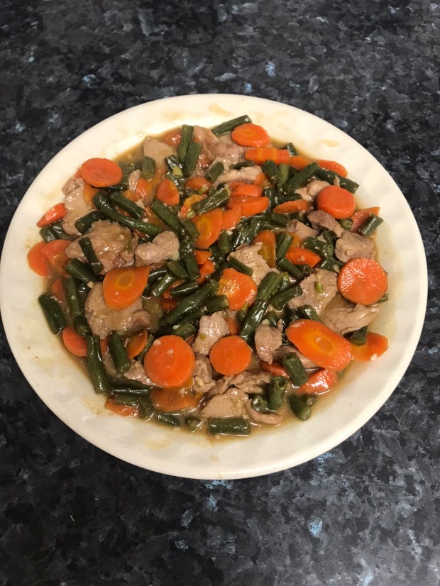 Bought a strip of pork neck from the Asian butcher, green beans and carrots from a supermarket for dinner to go with rice. At time, I like to add meat and vegetables together in a dish; safe time and less utensils to wash up.
