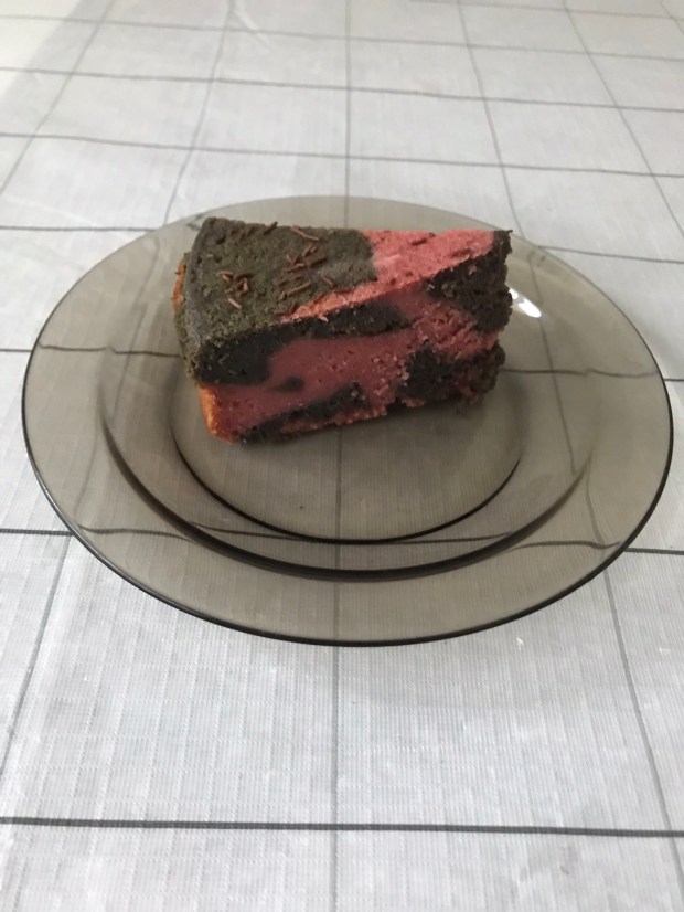 Spoon one big metal spoon of strawberry batter into the line prepared pan and then use a tablespoon spoon the black brown batter place next to the strawberry batter followed by strawberry batter and black brown batter cover the base make marble effect. The second layer, I spoon strawberry batter and black brown batter over the first layer giving more marbling effects then repeat marbling effect until both batters finished.