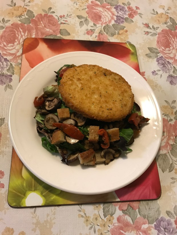 Meanwhile separate the salad equal portion into 4 plates, spoon some semi dried tomatoes and drizzle the oil over the salad. Then scatter the mushrooms croutons and baked mushrooms. Once done remove burgers and set it on top of the salad. Serve immediately with sweet white wine.