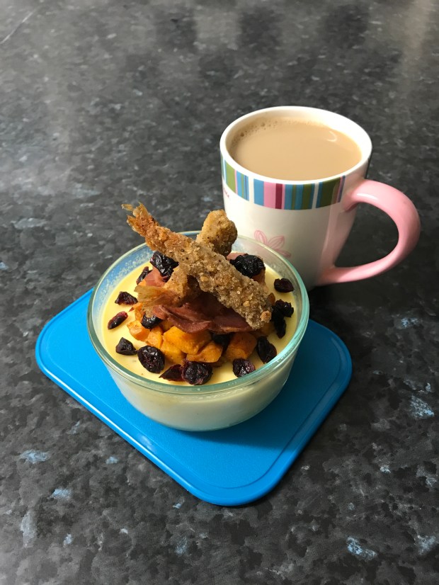 I have changed some ingredients to make it my own. My kheer has bacon, and craisins; it’s rich, creamy taste of my leftover Prawn pumpkin lemon posset: recipe link is attached at the bottom, skim milk, and condensed milk; is enhanced with fragrance of cardamom, curry and nutmeg powder. The different taste of Kheer is when and what you serve. It can be served hot or chilled. I prefer chilled and it’s a savoury- sweet Kheer with my own flavoured and toppings idea. Let’s be creative and cook!!!