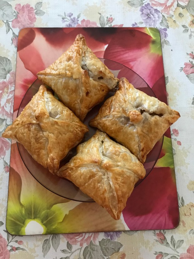 Fold 2 opposite sides and press their ends together. Repeat with the other opposite sides and seal them together. Then press the other sides to seal. Make sure the puff pastry is well closed and that there are no holes. Brush with the egg mix. Place the pastries on a baking sheet and bake for 25 min.