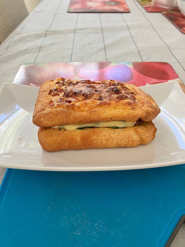 When the second bread is soaked, transfer to the prepared tray, using a spoon, make a slight indent in the centre. Filled with the cooked corned beef, arugula, spinach and a slice of cheese. Cook for 5 minutes. Bring out the cup, and place the slightly toasted bread on top of the second filled bread. Scatter some chili flakes. Put back into the machine, cook a further 2-3 minutes until cheese on top puff and browned.