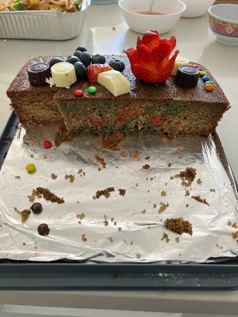Once time up, removed from oven onto wire rack to cool further 20 minutes. Then flip the cake out of pan onto foil cake plate mat and place into the base of the square container.