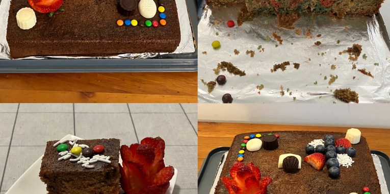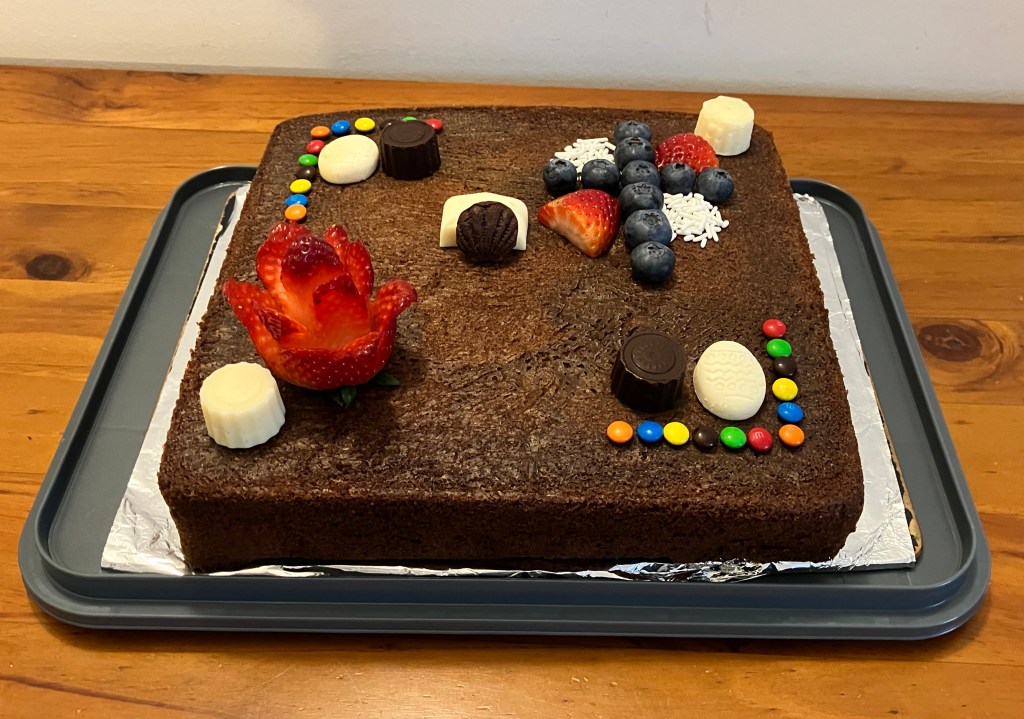 Then decorate little dark chocolate seashell in the middle of the cake; resting on a white chocolate bar shape. Next line different colours M & M on both corners opposite each other. Followed by one dark round chocoloate on each side, and one white Easter egg chocolate opposite each other.